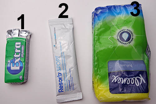 - 1: Extra chewing gum. This is packaging used in Scandinavia. It doesn't work well for places where it's humid. But it's wonderfully compact!