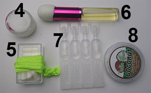 - 5: A small plastic case bought at Søstrene Grene, with Monolaurin capsules with a hair tie around it. Video coming on Monolaurin!