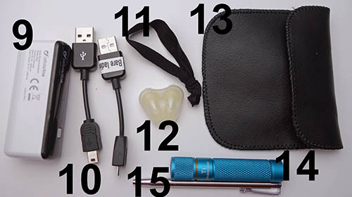 - 14: Thrunight Ti flashlight. This one is defunct, but there are lots of flashlight online. I prefer one that takes one AAA battery for my handbag/cart