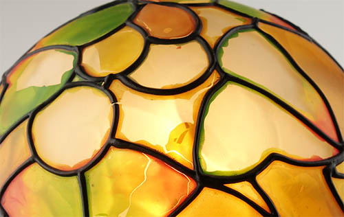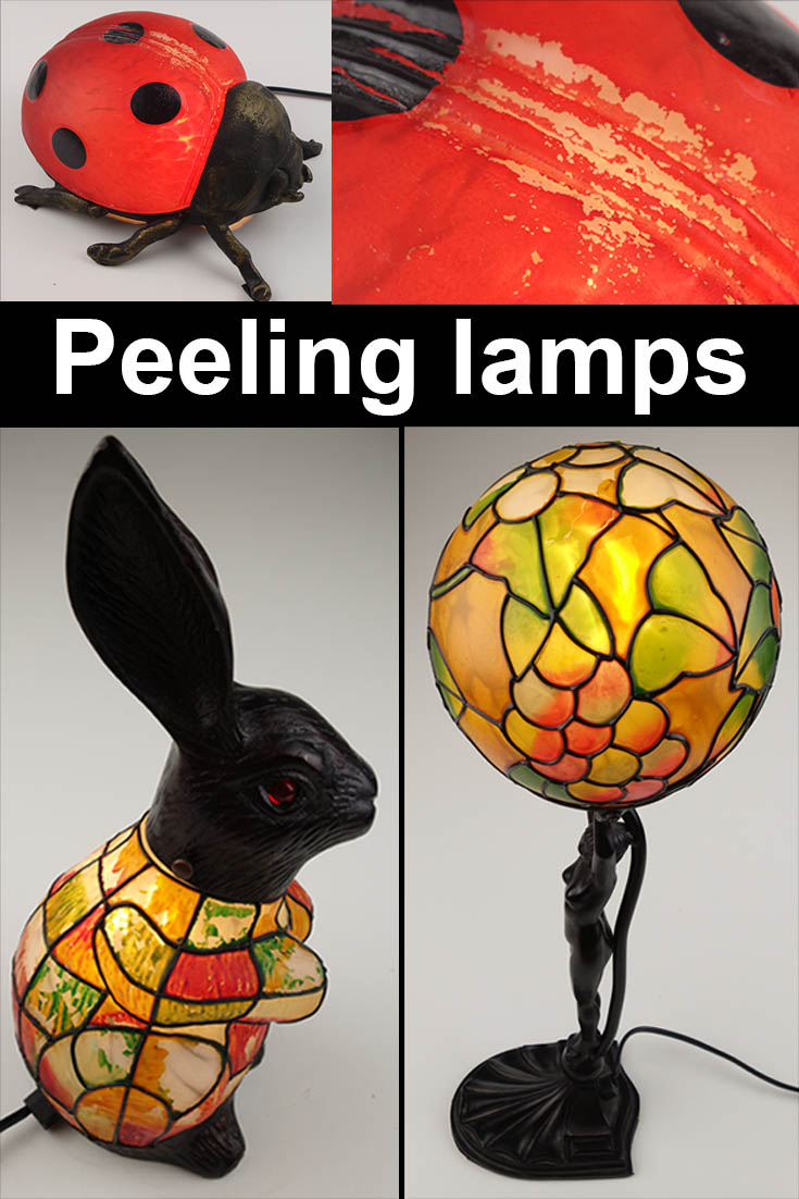 I love tiffay type lamps. Colored glass, whether it has "leading" or not. And I have quite a few, most bought many years ago. I have one that's made with stained glass, and some I don't know how they're made. But three of them are made with some sort of foil over frosted glass. And over time, that foil has started peeling. One had started peeling when I bought it, but the others got that way over time. The globe was on the top of a shelf turned on, and I believe the heat caused the foil to break up. The rabbit was OK until I placed it on a window shelf for a few years, and then suddenly it was peeling big time.